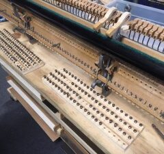 わずか1㎜というなかれ高速でシーソー運動する白鍵先端重量だから慣性モーメントの変化における特にタッチの戻り感はかなり違うのかもしれない。また、黒鍵との差異も少なくなるはずだ。鍵盤の材料も一見粗悪品に見えるくらいの柔らかく軽い木を使用している。当時の演奏家の要求に応えるべく見てくれより、瞬発力・反応優先で作られているのかもしれない。