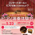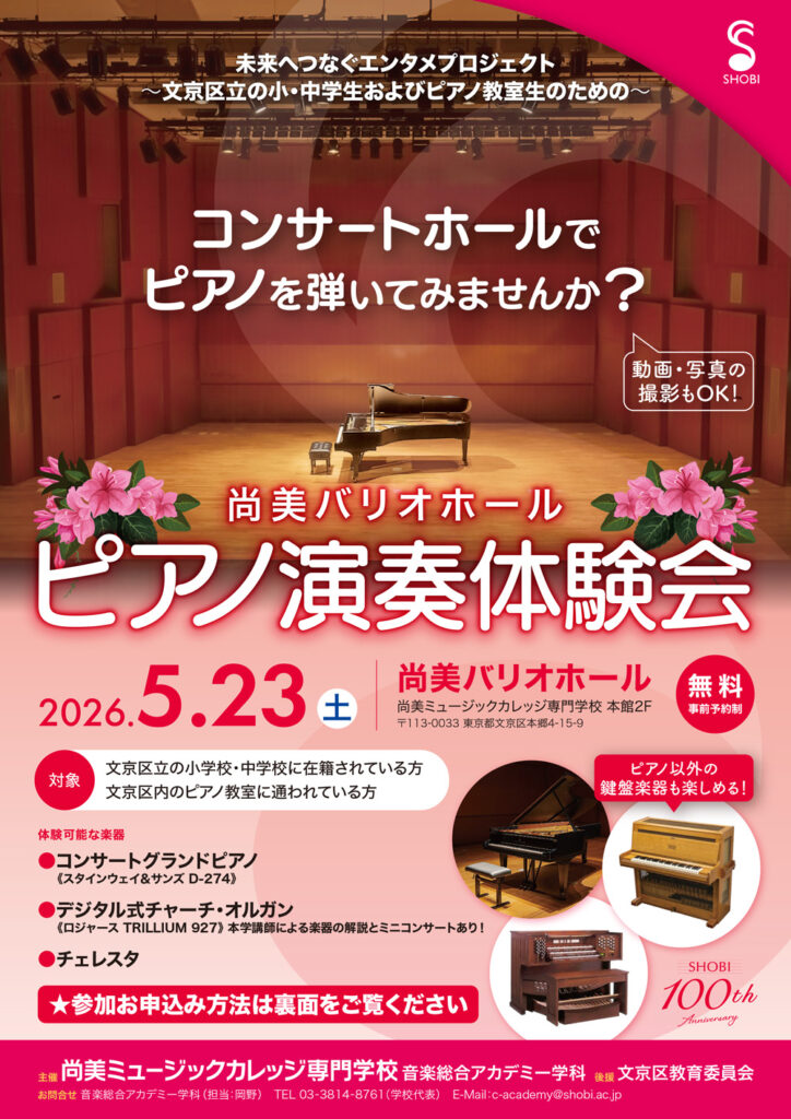文京区立の小・中学生およびピアノ教室生のための「尚美バリオホール ピアノ演奏体験会」 2026.04.23 文京区立の小・中学生およびピアノ教室生のための「尚美バリオホール ピアノ演奏体験会」 【日時】 2026年5月23日(土)11:30~17:30 お詳細 【会場】 尚美バリオホール(尚美ミュージックカレッジ専門学校 本館2F) 東京都文京区本郷4-15-9 【料金】 無料 ※事前予約制(申し込み多数の場合は抽選) 【参加お申込方法】 お申込みフォーム 【後援】 文京区教育委員会 【主催・お問合せ】 尚美ミュージックカレッジ専門学校 音楽総合アカデミー学科(担当:岡野) TEL:03-3814-8761(学校代表) E-Mail パッサージュメニュー 新着情報 イベントリポート ブログ おすすめ記事 展示ピアノメニューボタン 展示ピアノ一覧はこちら アクセスはこちら ピアノパッサージュホームはこちら 演奏会&試弾会案内はこちら サロン・ド・パッサージュ
