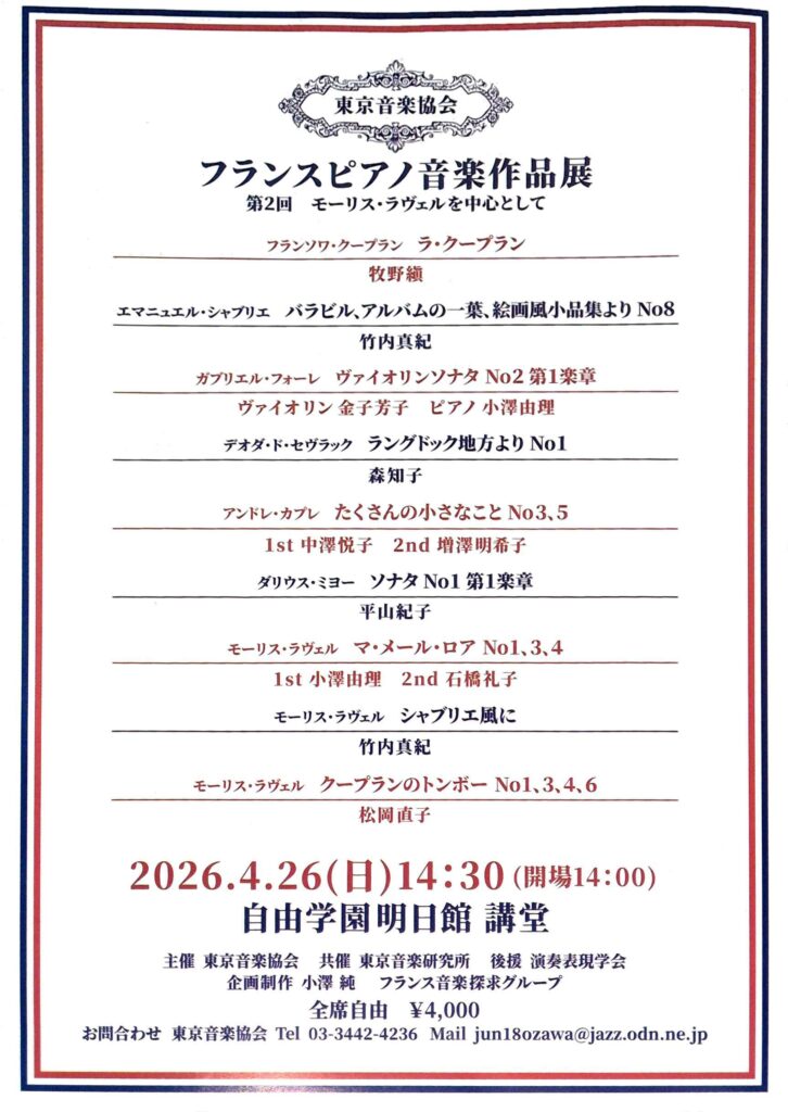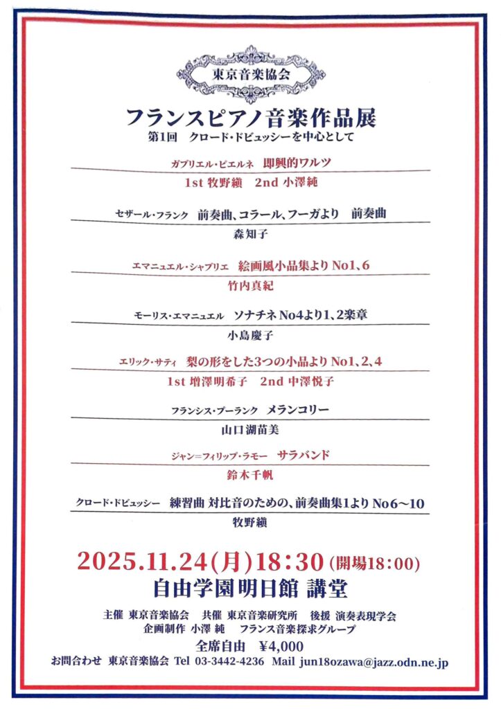 東京音楽協会 フランスピアノ音楽作品展 第1回 クロード・ドビュッシーを中心として 2025.11.24 第2回 モーリス・ラヴェルを中心として2026.4.26 2025.11.15 パッサージュメニュー 演奏会&試弾会案内はこちら サロン・ド・パッサージュ 新着情報 イベントリポート ブログ おすすめ記事 展示ピアノメニューボタン 展示ピアノ一覧はこちら アクセスはこちら ピアノパッサージュホームはこちら