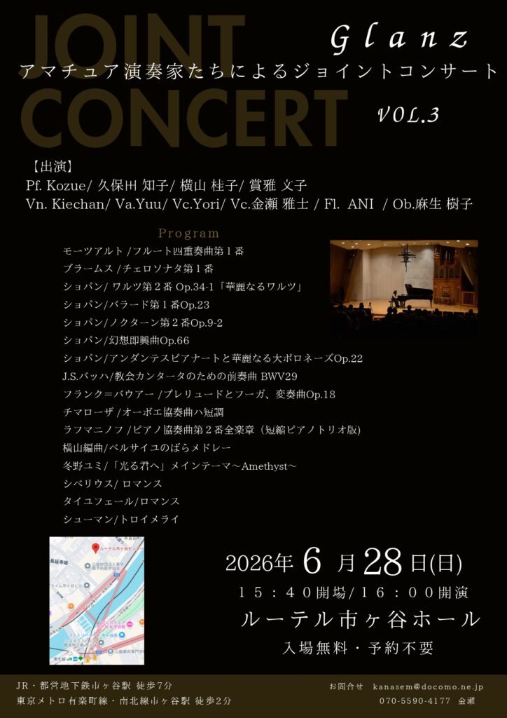 Glanz アマチュア演奏家たちによるジョイントコンサート Vol.3 2026.6.28 2026.04.23 Glanz アマチュア演奏家たちによるジョイントコンサート Vol.3 2026.6.28 パッサージュメニュー 新着情報 イベントリポート ブログ おすすめ記事 展示ピアノメニューボタン 展示ピアノ一覧はこちら アクセスはこちら ピアノパッサージュホームはこちら 演奏会&試弾会案内はこちら サロン・ド・パッサージュ