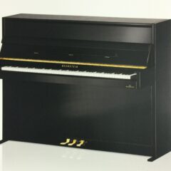 このモデルはザウターが製造するグランドピアノで最もコンパクトなピアノです。外装はウォルナット艶消しですが、鍵盤蓋の内側は鏡面仕上げになっています。サロンやホールにあるピアノは艶出しの外装がほとんどで、鍵盤蓋に演奏者の手が反射して映り込みます。それと同じ視覚効果を感じながら練習出来るようにするため、全体は艶消しですが鍵盤蓋の内側のみ艶を出しています。響板を可能な限り薄くし、クラウンを大きくすることで、ブリリアントで明るい音色を実現しています。南ドイツ・ウィーン派のルーツであるクラヴィコードはチェンバロのような音量は出ませんが、強弱がはっきり付けられるうえビブラートをかけられるため、繊細なニュアンスの表現を得意としていました。ザウターピアノもその表現力を受け継いでおり、他のピアノにはない独特の響きを形成しています。