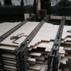 その2で接ぎ合わされた響板の厚みは最終的には8mm~12mmくらいに削られます。低音部を薄くしたり、高音部を厚くしたり、周辺部を薄くして中央を厚くするなど、メーカーの求める音によっていろいろ工夫が見られます。